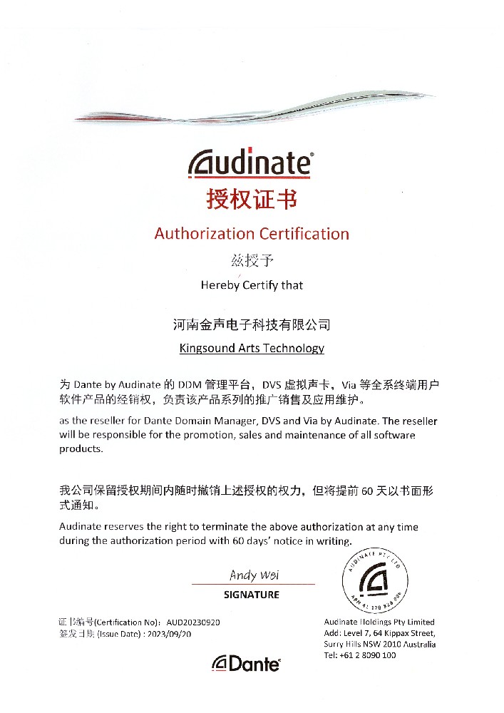 我司正式同澳大利亚品牌Audinate签约,成为Audinate中国大陆地区河南省代理经销商,在中国大陆地区代理销售Audinate产品Dante Domain Manager(DDM)、Dante ···