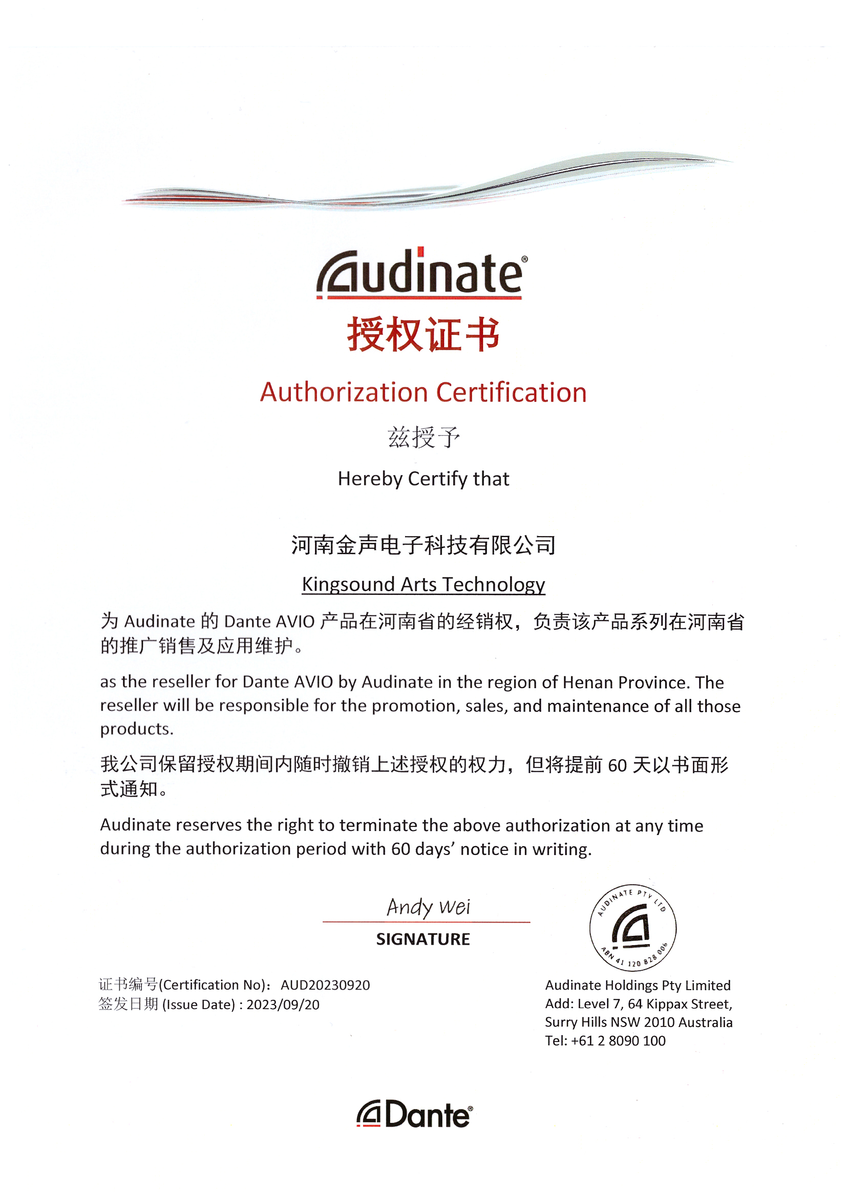 我司正式同澳大利亚品牌Audinate签约,成为Audinate中国大陆地区河南省代理经销商,在中国大陆地区代理销售Audinate产品Dante Domain Manager(DDM)、Dante Virtual Soundcard(DVS)、Dante Via与Dante AVIO。